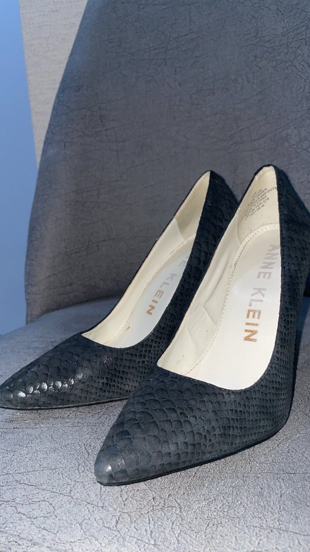 Klasik iş görünümü için tokalı, siyah yılan derisi desenli stiletto topukludur. Marka: Anne Klein.
