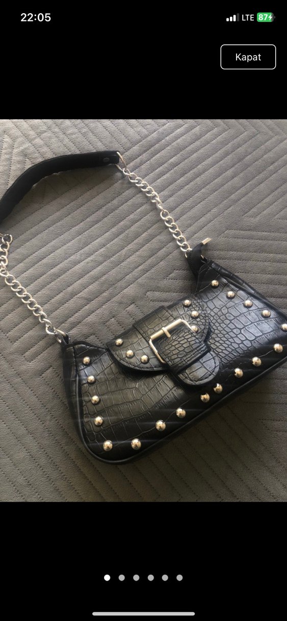 Siyah yılan derisi desenli deri çanta, tokalı kapak ve gümüş renkli çivilerle süslenmiş. Zincir ve deri askıya sahip, goth ve Paris sokak tarzını yansıtıyor.