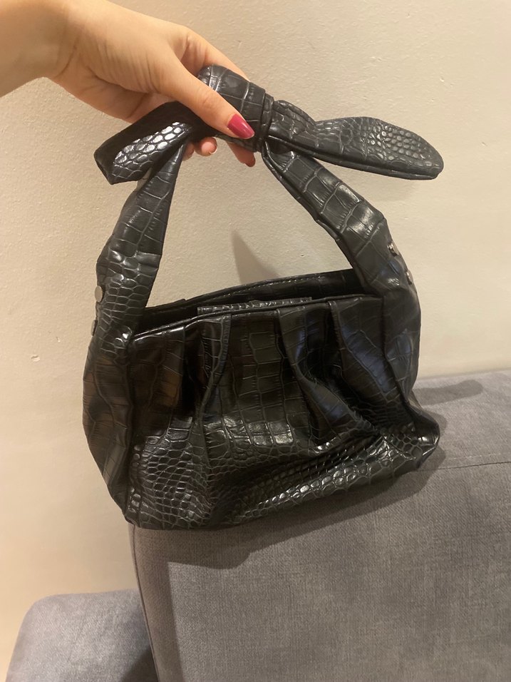 Siyah yılan derisi desenli, tokalı saplı deri kadın çantası, sokak modasına uygun ve günlük kullanıma ideal. Tertemiz. Evden cıksın diye cok uygun fiyata