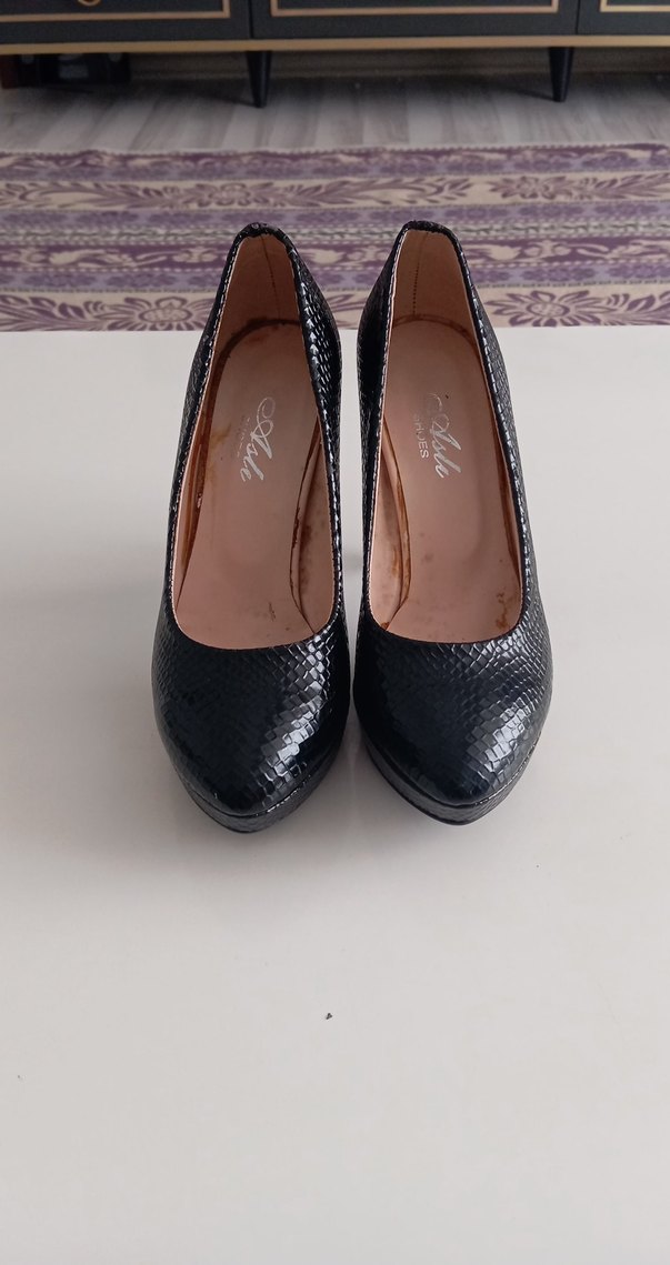 Siyah yılan derisi desenli, tokalı stiletto topuklu ayakkabı. Kauçuk malzemeden, klasik ve minimalist ofis stiline uygun.