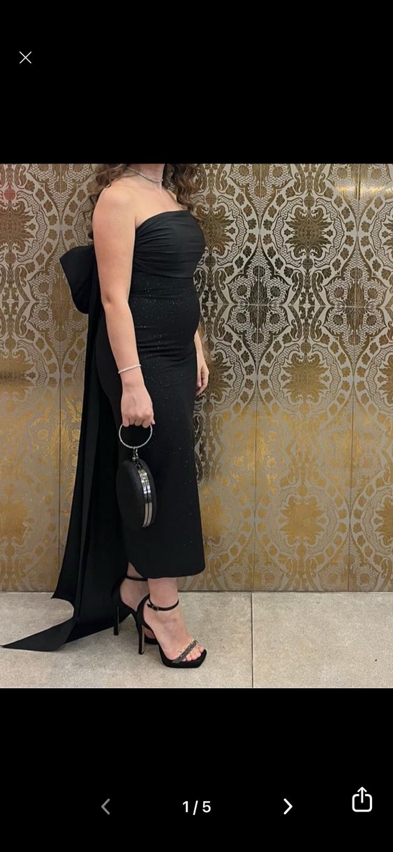 Siyah, yılan derisi desenli, uzun ve vücuda oturan bu abiye elbise, straplez yaka ve kemerli bel detayıyla klasik şıklığı gotik tarzla buluşturuyor. İnce askılı kollar romantik akşamlara uygun.