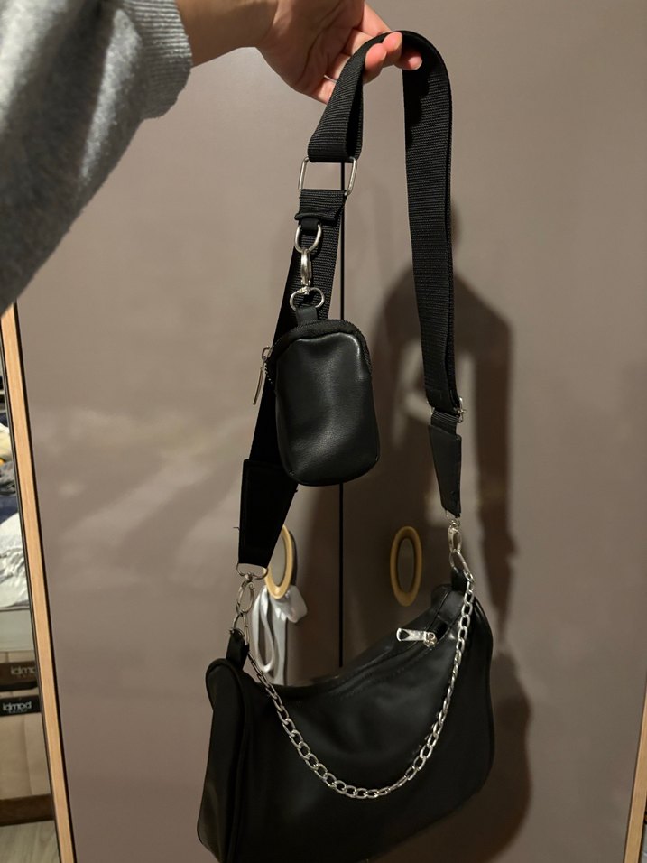 Siyah yılan derisi desenli deri çanta, zincir detaylı ve çıkarılabilir küçük cüzdanlı. Günlük kullanım için uygun, trend sokak stili.