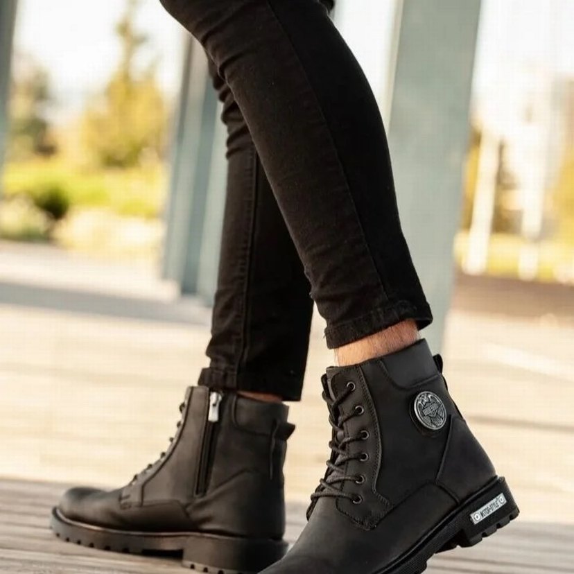 Yılan desenli siyah deri erkek bot, bağcıklı ve yan fermuarlı tasarıma sahip. Sokak modasına uygun şık bir model.