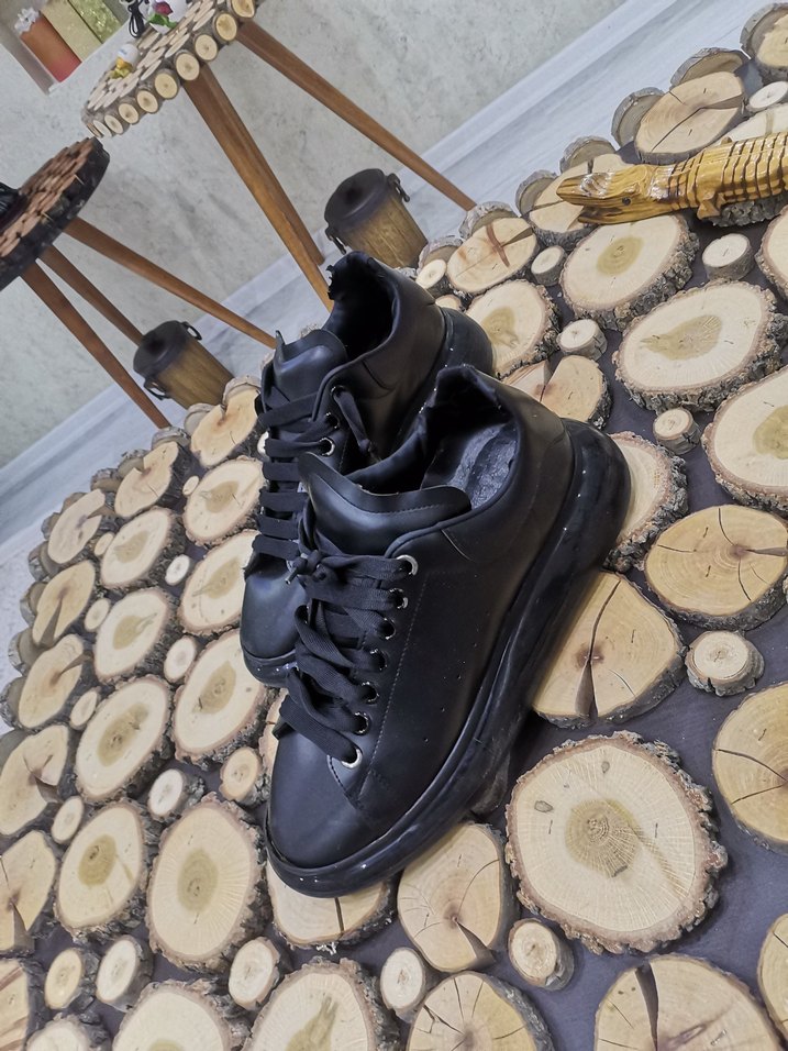 Siyah yılan desenli ve bağcıklı erkek spor ayakkabısı, kauçuk tabanlıdır ve günlük kullanıma uygundur.