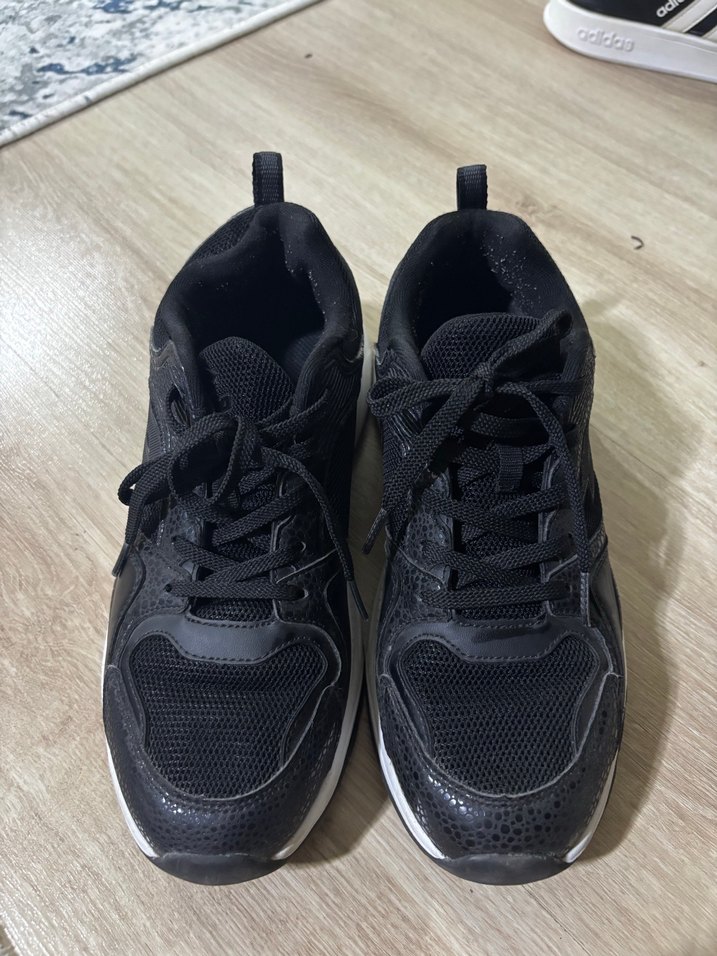 Siyah yılan desenli, bağcıklı biraz kalın topuklu kadın spor ayakkabısı. Spor ve sokak giyimi için uygundur. 40 numara çok giyilmedi temiz