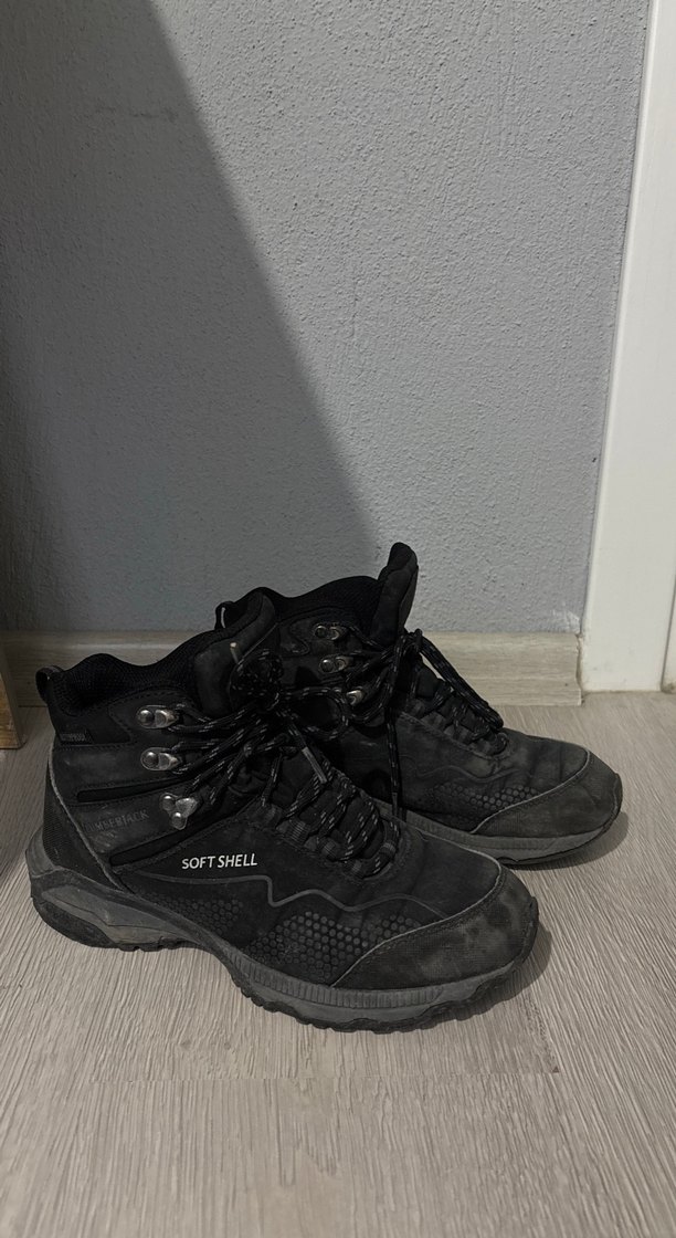 Siyah yılan desenli, bağcıklı outdoor botlar. Dayanıklı kauçuk malzemeden, 'SOFTSHELL' yazılı, spor ve sokak stiline uygun.
