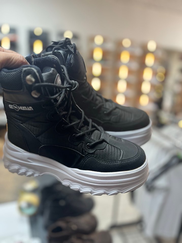 Siyah yılan desenli, bağcıklı, platform topuklu kadın botları. Kauçuk malzemeden üretilmiş, sokak stiline ve spor kullanıma uygundur.