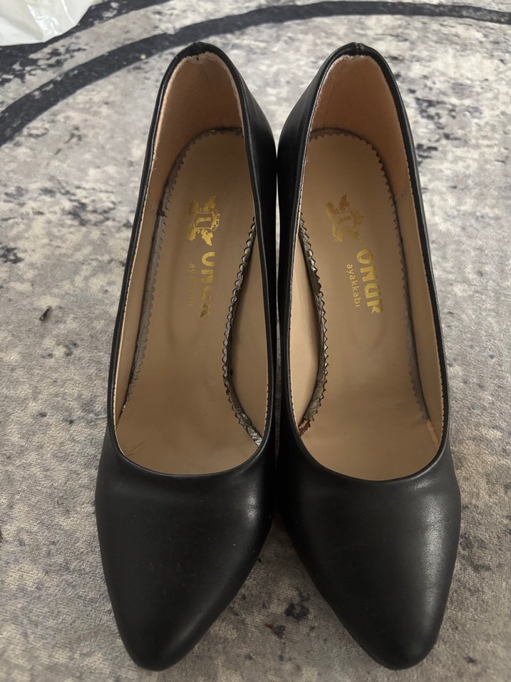 Siyah yılan desenli, bağcıklı ve kauçuk malzemeden yapılmış stiletto topuklu ayakkabı. Ofis için klasik tarzda.