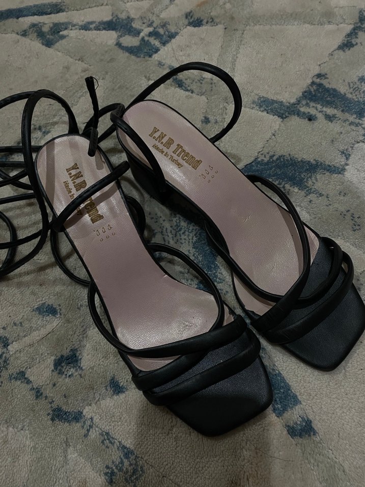 Siyah yılan desenli, bağcıklı tasarıma sahip kadın sandaletleri, stiletto topuklu ve kauçuk malzemeden, romantik akşamlar için uygun.