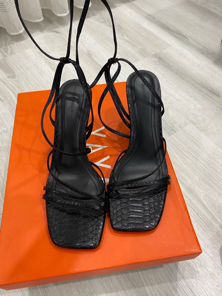 Siyah yılan desenli, bağcıklı ve kauçuk malzemeden yapılmış stiletto topuklu sandalet. Sokak stili ve günlük kullanım için uygundur.