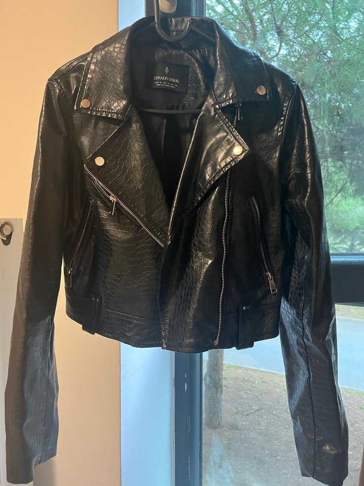 Siyah, yılan desenli, fermuarlı detaylara sahip, oturan kesim biker deri ceket. Günlük kullanıma uygun, şık bir parça.