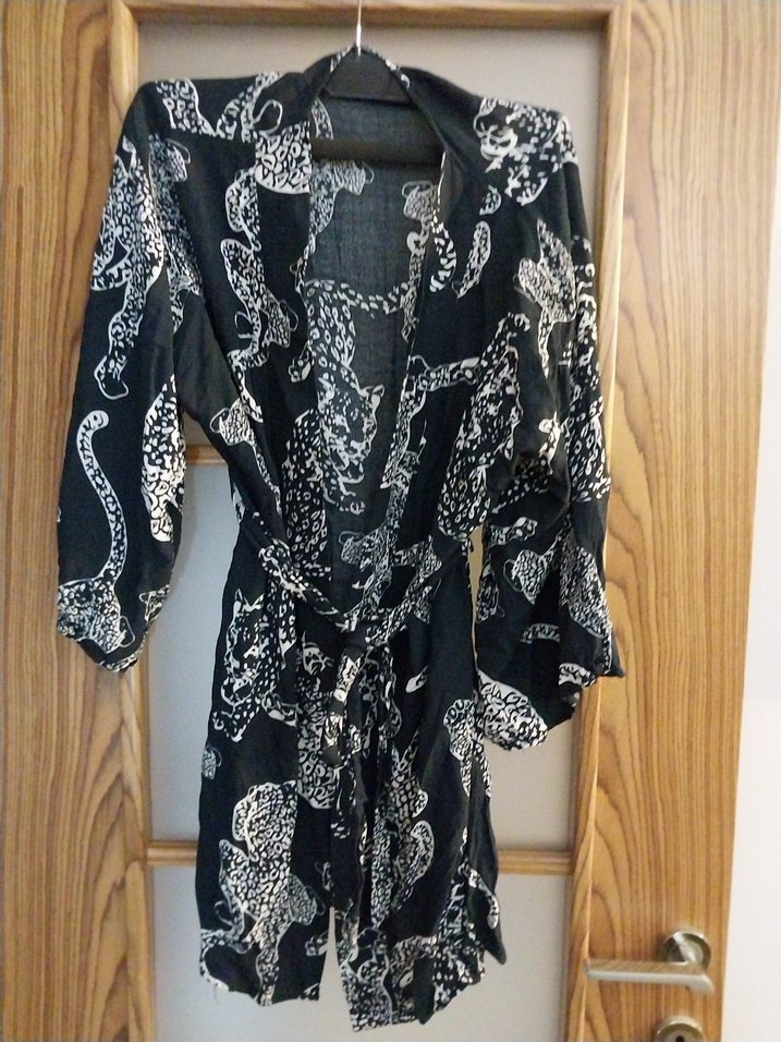 Siyah yılan desenli bohem uzun kimono, uzun kollu, straplez yakalı, dökümlü ve rahat kesimlidir. Tekstilden üretilmiştir.