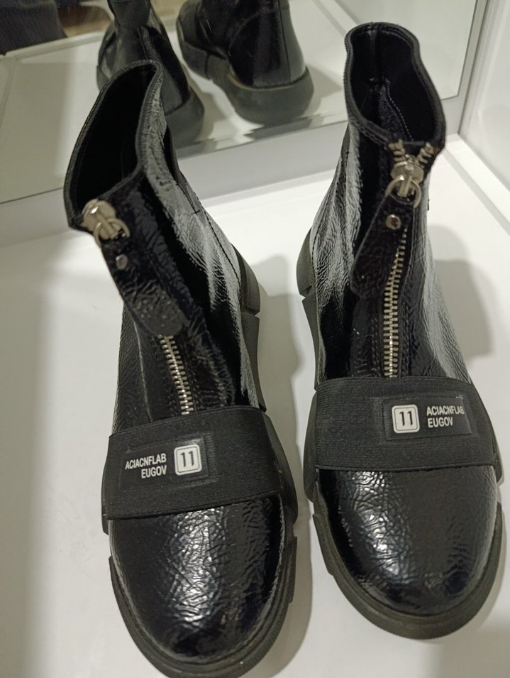 Siyah yılan desenli deri botlar, ön fermuar ve blok topuklu. Sokak stiline uygun, trend görünümlü. "EUGON" markalı.