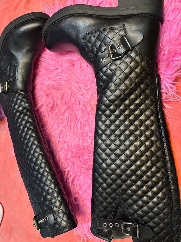 Yılan desenli siyah deri dizüstü çizmeler, stiletto topuklu ve tokalı detaylara sahip, avangart biker tarzında. Hiç kullanılmamış