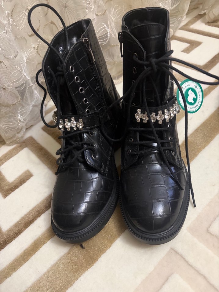 Siyah yılan desenli deri gotik botlar, blok topuklu ve tokalıdır. Taşlı kayış detaylarıyla günlük kullanıma uygundur. Etiketli hiç kullanılmadı.