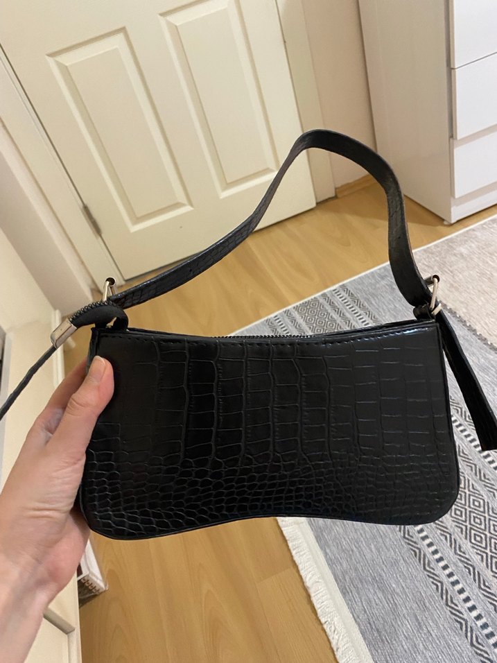 Siyah yılan desenli deri çanta, tokalı askısı ile günlük sokak stiline uygun şık bir modeldir.