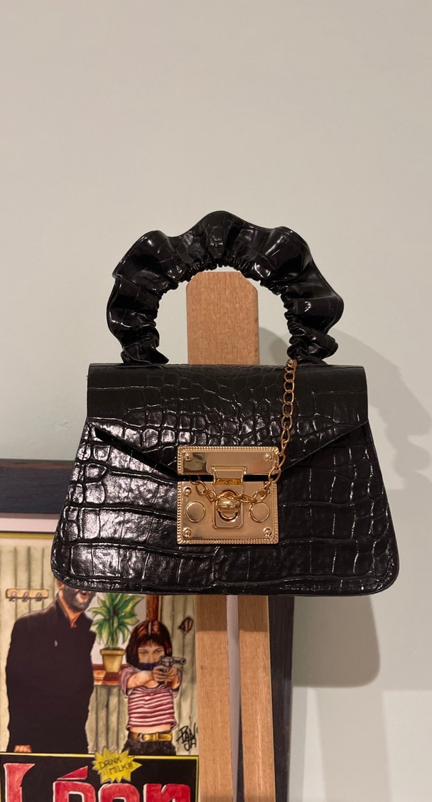 Siyah yılan desenli deri kadın çantası, tokalı altın renkli kilit detayına sahip. Büzgülü sapıyla klasik zarafeti gotik tarzla buluşturur küçük bir çantadır ürünün beyazıda mevcuttur.