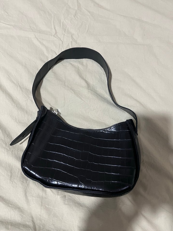 Siyah yılan desenli deri kadın çanta, tokalı askısı ve minimalist tarzıyla günlük sokak stiline uygundur.