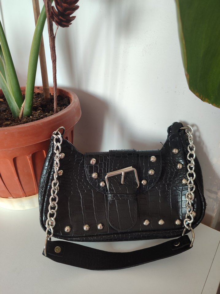 Siyah yılan desenli deri kadın çanta, tokalı ve gümüş zincir askılı, rock punk tarzında günlük kullanıma uygun.