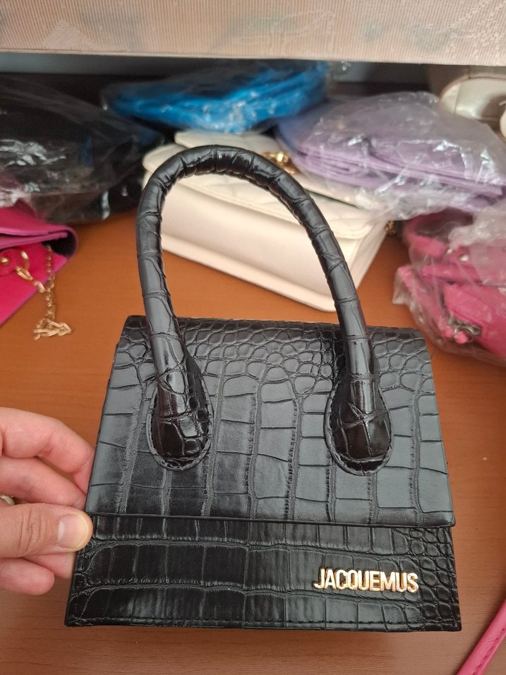 Jacquemus marka siyah deri, yılan desenli, tokalı saplı kadın çantası. Günlük kullanıma uygun sokak stili.