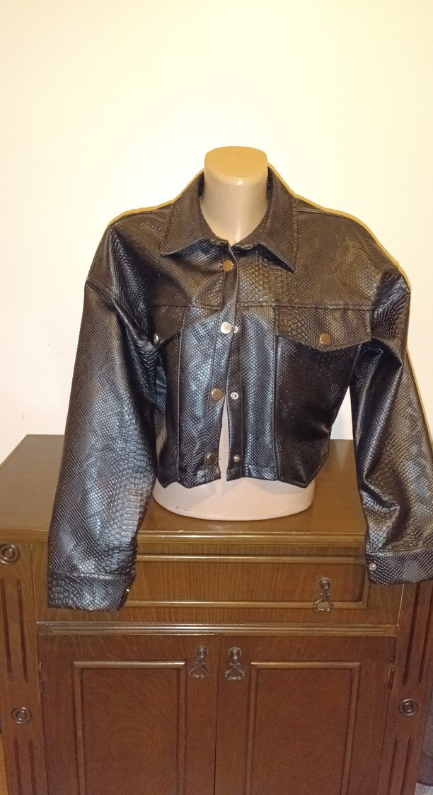 Siyah yılan desenli deri kadın ceket, düğmeli ve kesik yakalıdır. Uzun kollu, bol ve kısa kesimiyle trend sokak stiline uygundur.