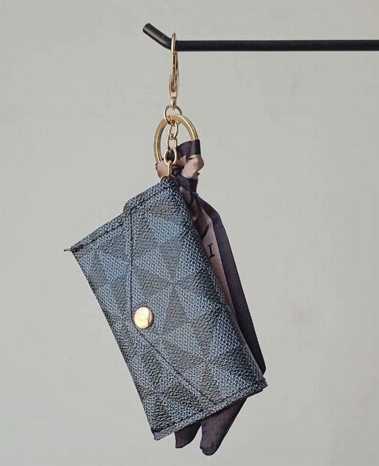 Siyah yılan desenli deri kadın cüzdan, tokalı detay ve altın renkli halka ile bağlanmış fular aksesuarı içerir.