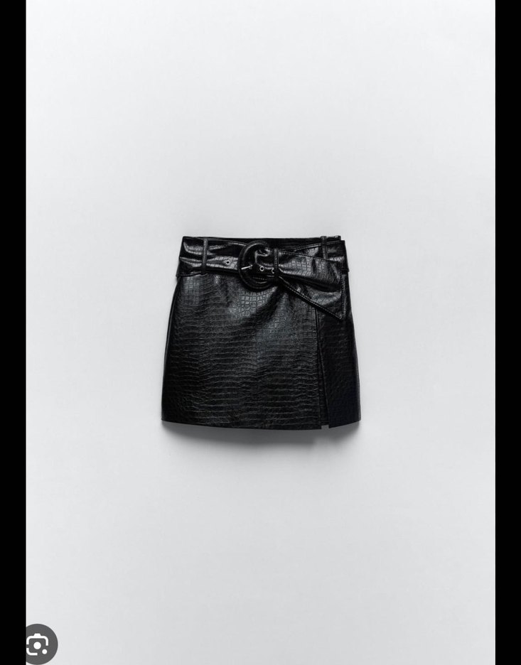 Siyah yılan desenli deri mini etek, kemerli ve dar kesim, sokak stiline uygun.