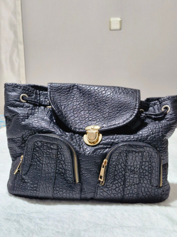 Siyah yılan desenli deri sırt çantası, tokalı kapama ve çoklu fermuarlı ceplerle günlük kullanıma uygundur.