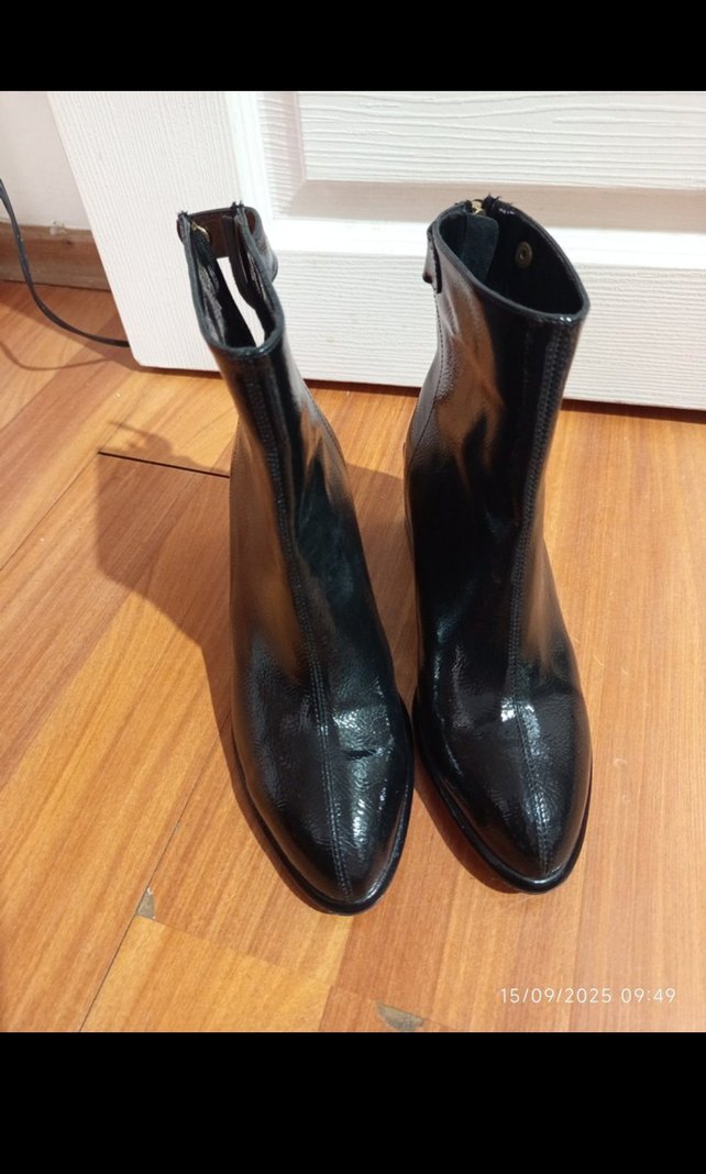 Parlak yılan desenli siyah deri kadın botları, ince topuklu ve tokalı. Minimalist gotik tarzda, günlük kullanıma uygun.