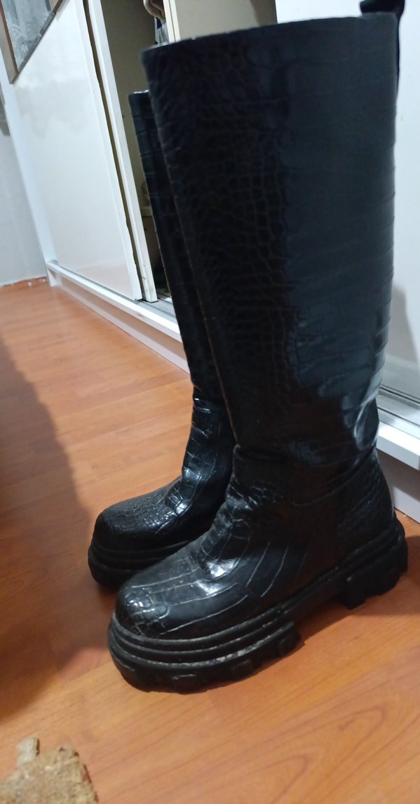 Siyah yılan desenli diz üstü lastik botlar, ince stiletto topuklu ve tokalı detaylara sahip. Gotik tarzda, günlük kullanım için uygun şık bir model.