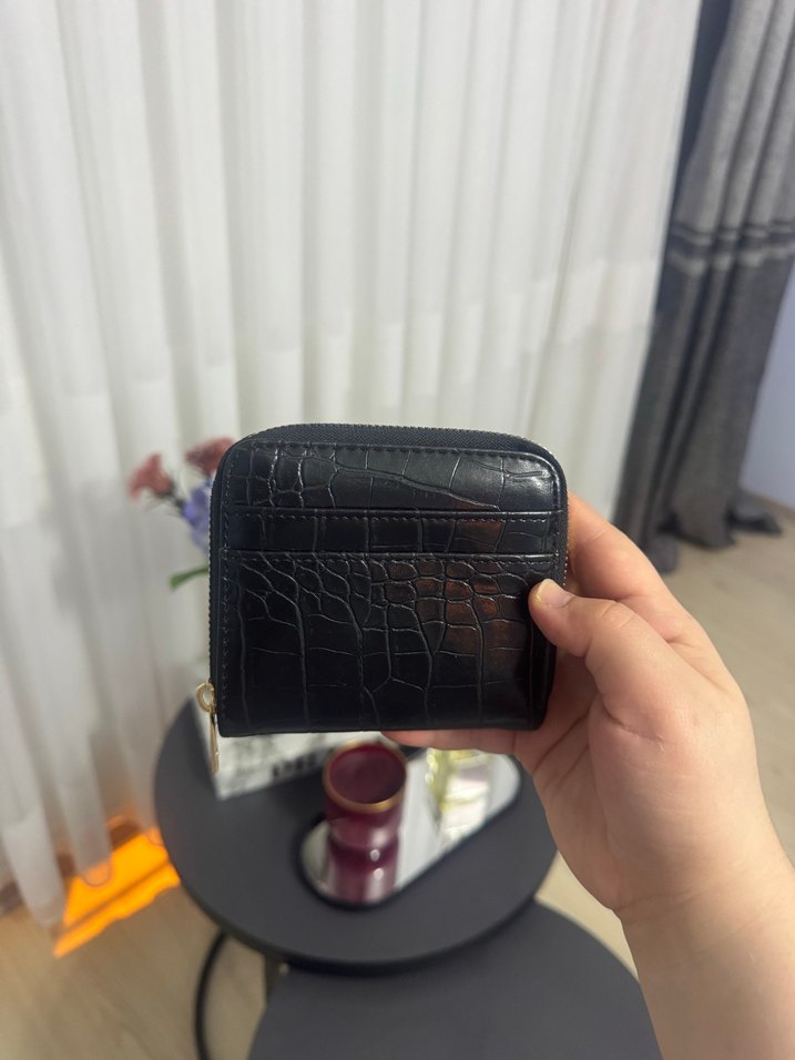 Siyah yılan desenli deri kadın cüzdanı, fermuarlı ve günlük kullanım için uygun, sokak modasına uygun tarzda.