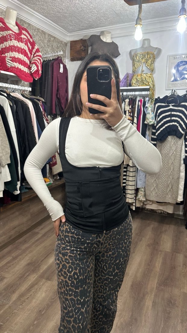 Siyah yılan desenli, normal boy midi uzunlukta, vücuda oturan hemşire korsesi. Şık ve destekleyici yapıya sahiptir.