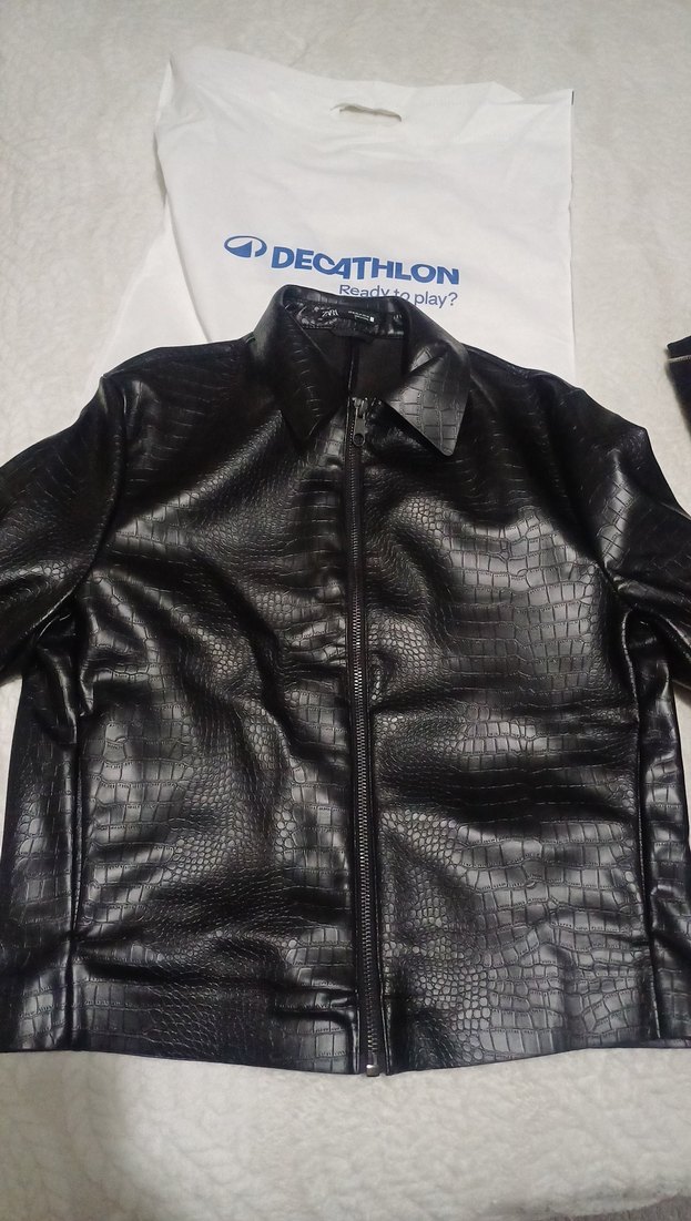 Siyah yılan deseniyle kaplı, fermuarlı ve kesik yakalı, fitted kesim deri biker ceket. Midi boyda, sokak stiline uygun. Marka: Decathlon.