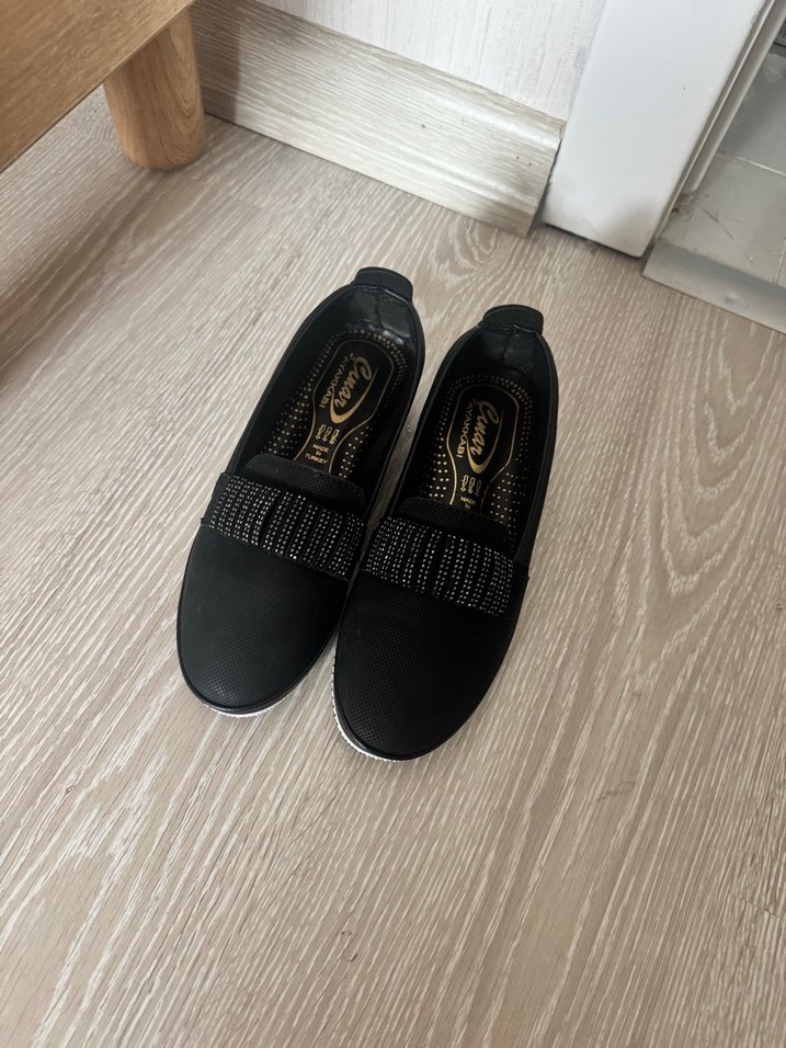 Siyah yılan desenli, elastik bantlı, dolgu topuklu kadın babet. Günlük kullanıma uygun, rahat ve şık bir sokak stili ayakkabısı.