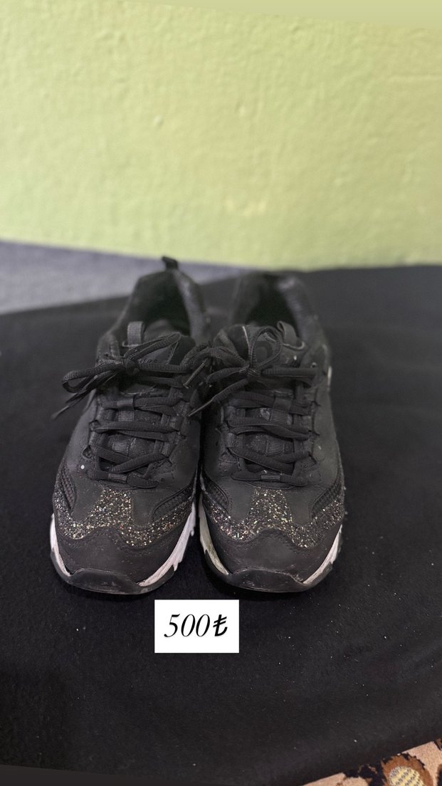Yılan desenli ve ışıltılı detaylara sahip siyah kadın spor ayakkabısı, ince topuklu ve kauçuk tabanlıdır. Fiyat: 500₺.