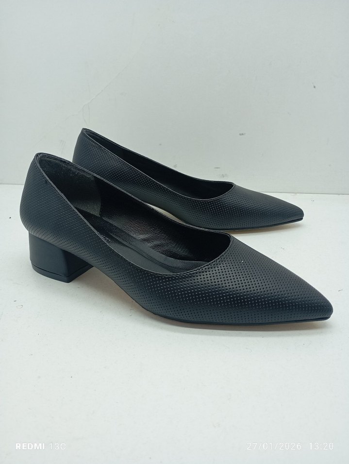 Topuk boyu 3 cm Siyah yılan desenli, blok topuklu kadın ayakkabısı. Kauçuk malzemeden üretilmiş, modern klasik tarzı ve zahmetsiz şıklığı bir arada sunar. Ofis için uygundur.
