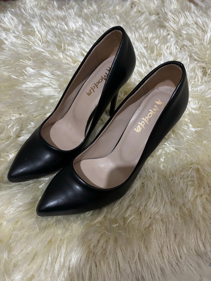 Siyah yılan desenli ve kürk detaylı, kauçuk malzemeden üretilmiş klasik şıklıkta ofis stilettosu.