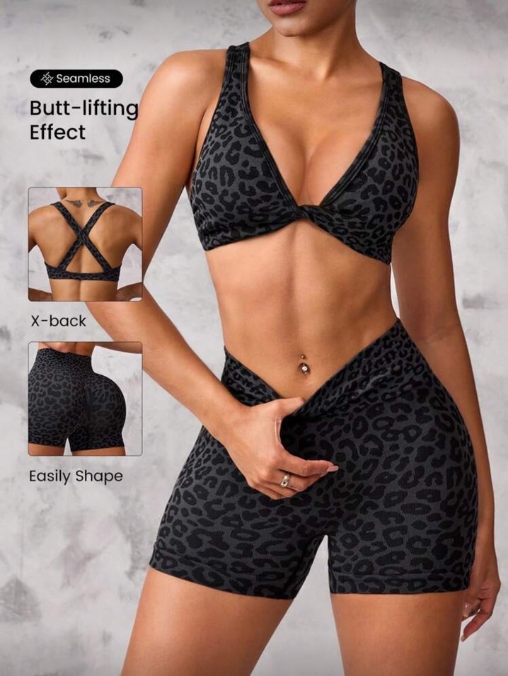 Siyah yılan desenli, V yakalı ve askılı, X sırt detaylı mini spor takımı. Elastik sentetik kumaşıyla kolay şekillenir ve popo kaldırıcı etkisi sunar.