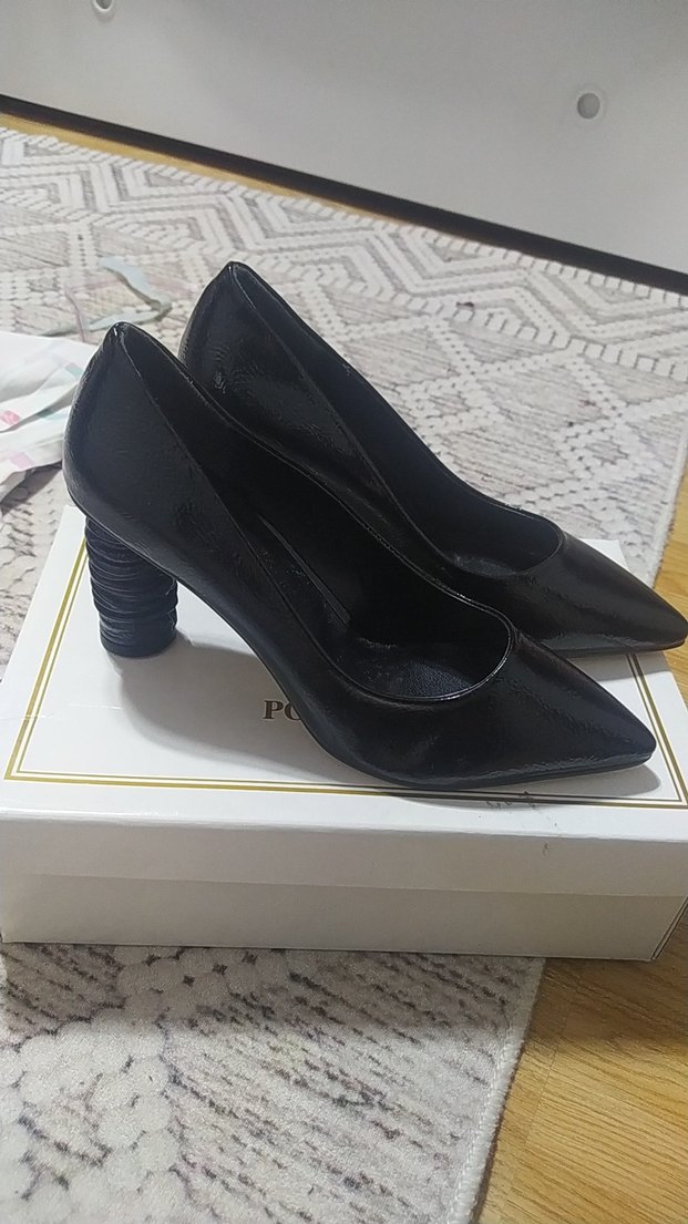 Siyah yılan desenli, plise detaylı ve kauçuk malzemeden yapılmış modern klasik stilettolar, ofis için uygun.