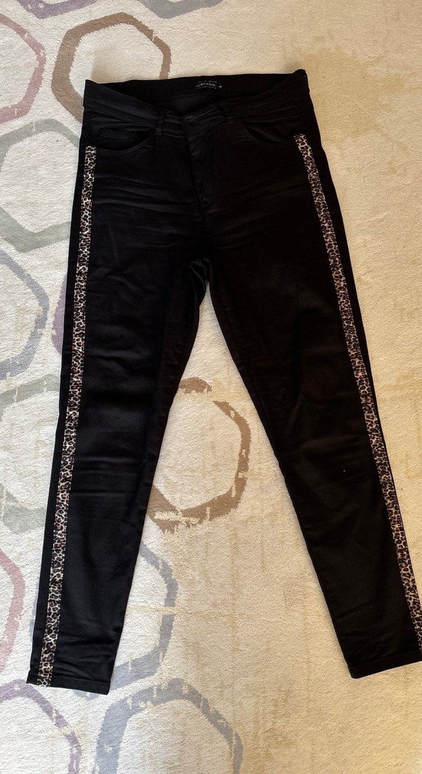 Siyah, yılan desenli ve yanları payetli şeritlerle süslenmiş kadın pantolonu. Sentetik kumaştan, normal boy ve regular fit, günlük kullanım için uygundur. Sorunsuz likralıdır