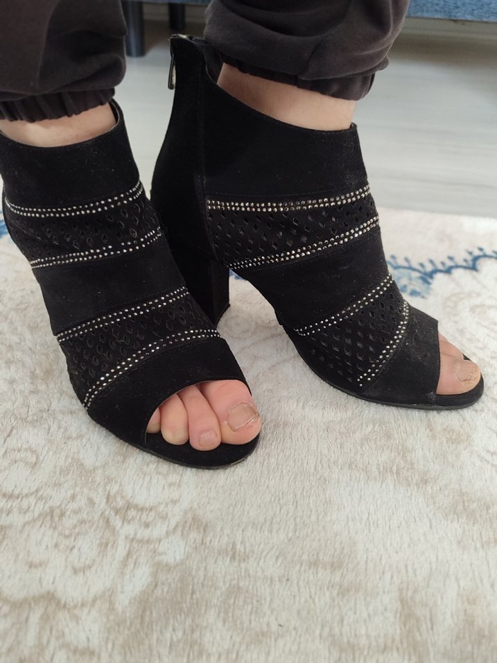 Siyah yılan desenli ve payet detaylı, lastik malzemeden yapılmış stiletto topuklu gece ayakkabısı. Trendy casual ve goth tarzına uygun.