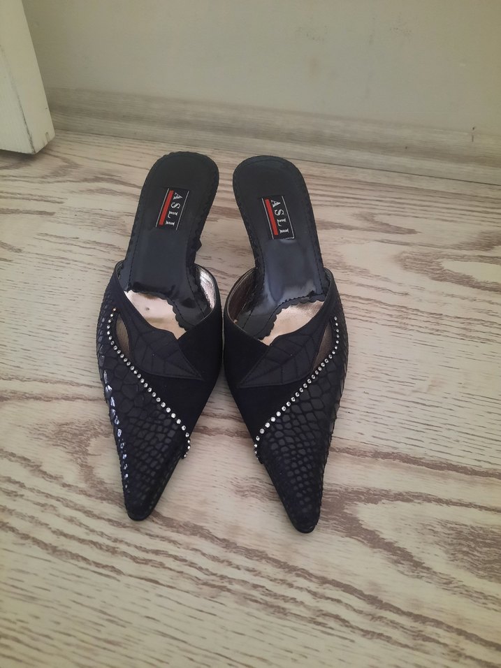 Siyah yılan desenli ve pilili detaylara sahip stiletto topuklu kadın ayakkabısı. Kauçuk malzemeden, ASLI markası. Cesur ve minimal stil için uygundur.
