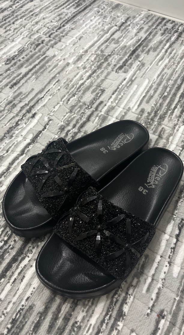 Siyah yılan desenli, tokalı platform topuklu terlikler. Kauçuk malzemeden yapılmış, rahat ve trend günlük kullanım için uygundur.