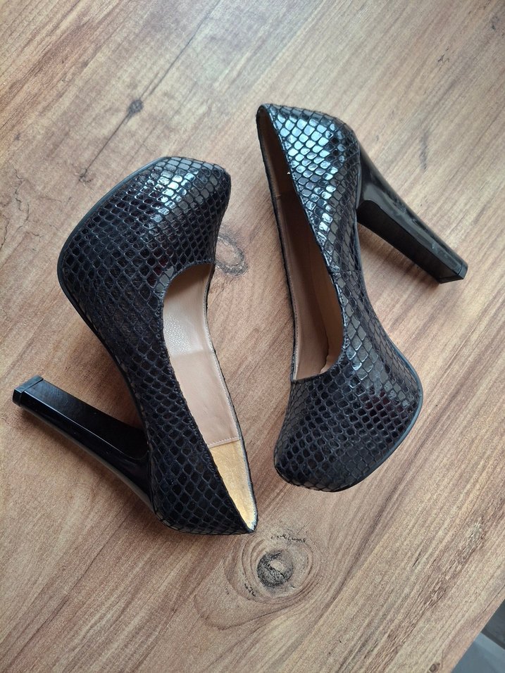 Siyah yılan desenli platform topuklu, tokalı kadın ayakkabısı, cesur ve şık bir görünüm için idealdir.
