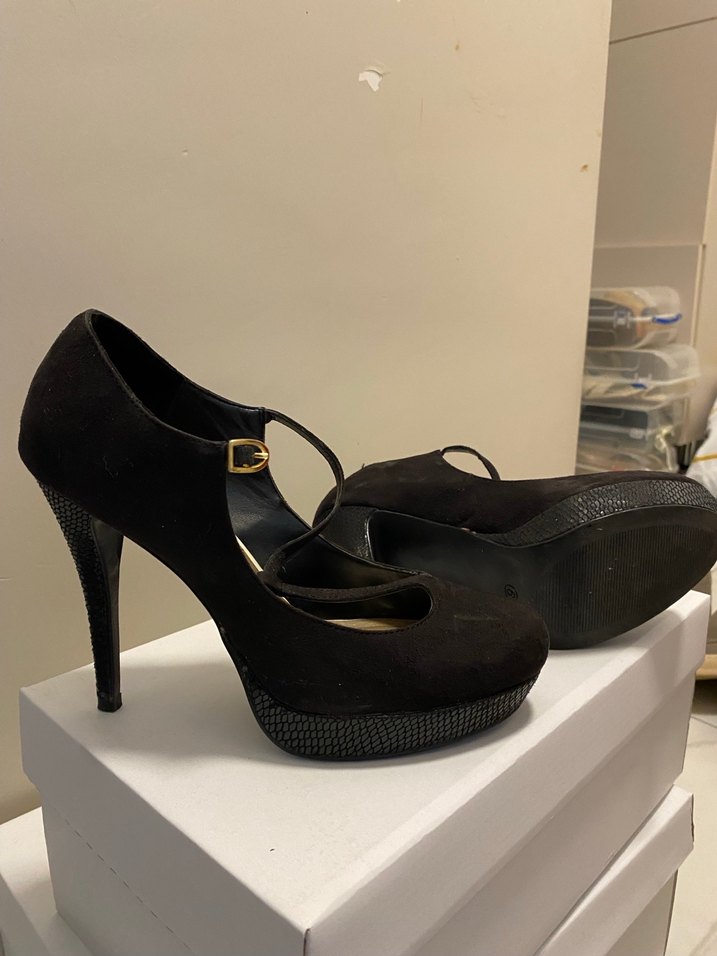 Yılan desenli detaylara sahip siyah platform topuklu kadın ayakkabısı. Tokalı kayışı ile güvenli kullanım sağlar, romantik akşamlar için uygun.