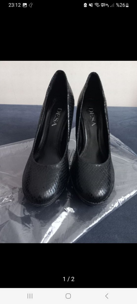 Siyah yılan desenli platform topuklu, lastik malzemeden yapılmış, pileli kadın ayakkabısı. Ofis kullanımı için cesur, goth tarzda.