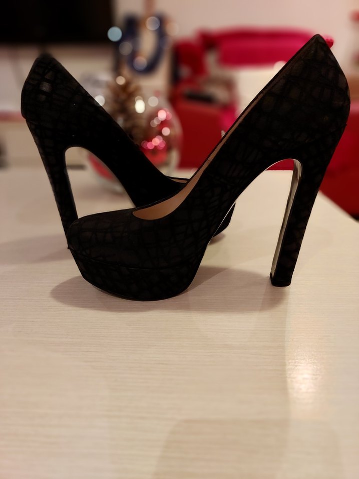 Siyah yılan desenli platform topuklu stiletto, dantel detaylı ve cesur gotik tarzda, romantik akşamlar için uygun. Hakiki deri