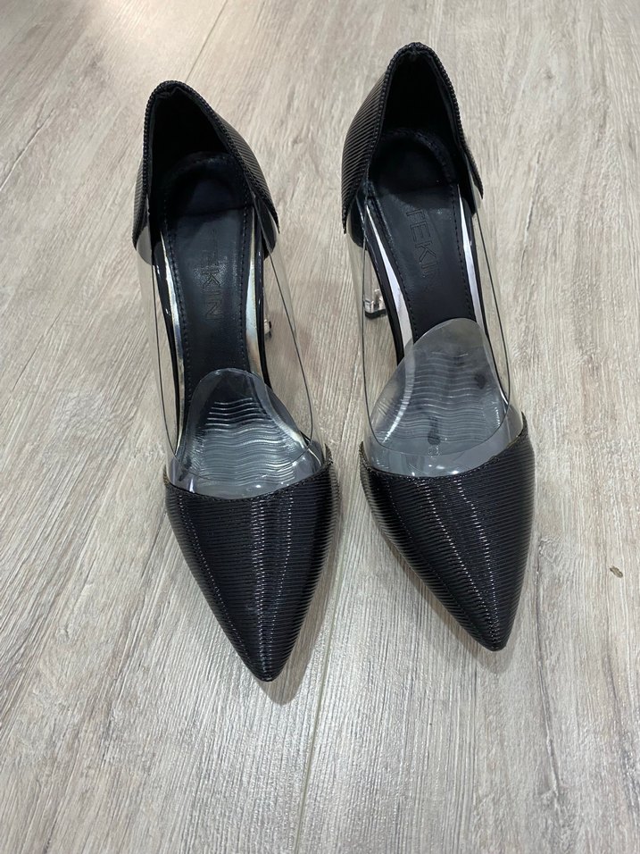 Ofis kullanımı için uygun, siyah yılan desenli, pliseli ve kauçuk dokulu stiletto topuklu ayakkabı.