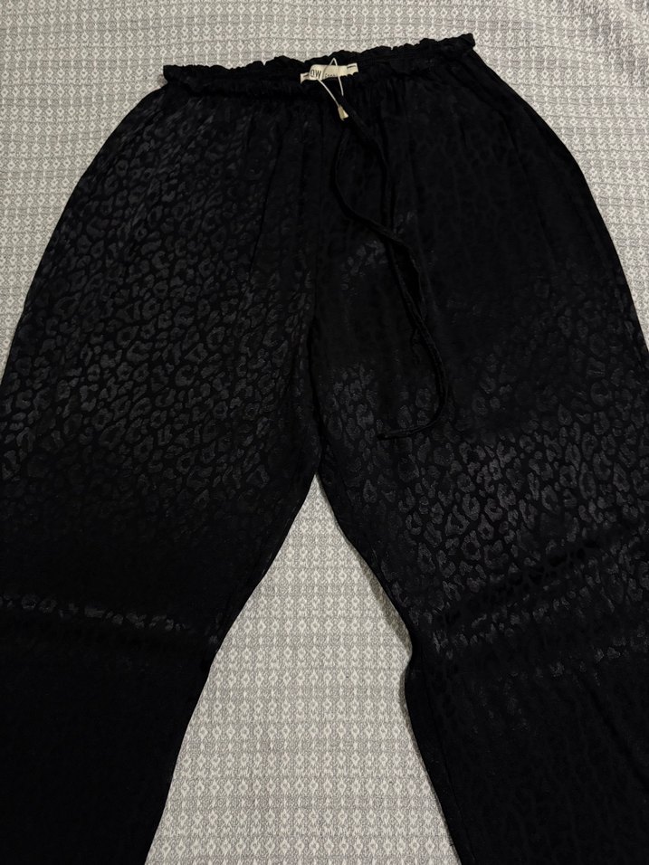 Siyah yılan desenli, rahat kesim kadın pantolon. İpeksi kumaştan, tokalı detaylı, midi boy, günlük kullanıma uygun.