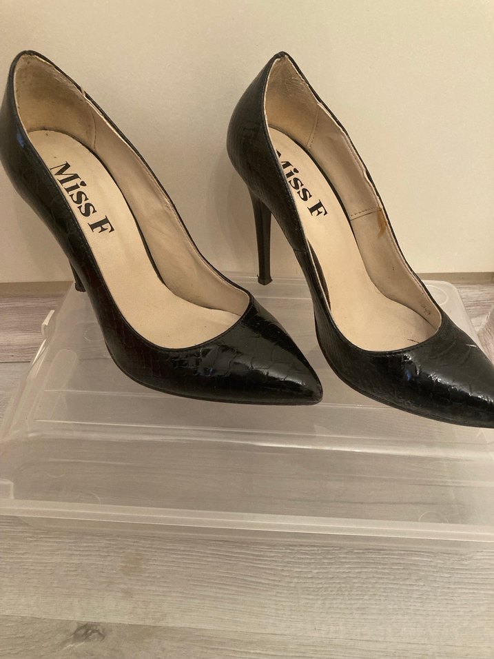 Siyah yılan desenli rugan stiletto topuklu ayakkabı, kauçuk malzemeden. Klasik gotik tarzda, ofis için uygun.